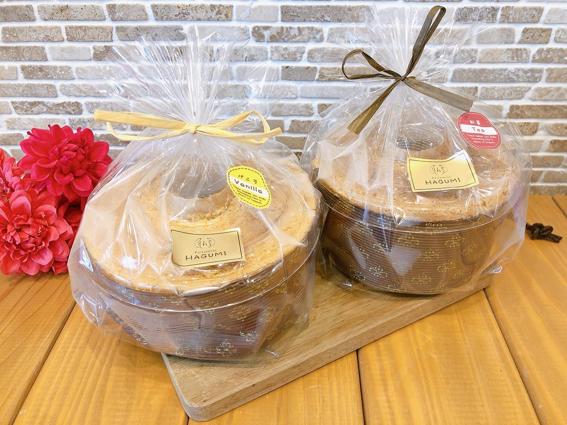シフォンケーキ先日から出ています♬ お味は♡バニラ?紅茶の2種類 どちらもフワフワの軽い生地であっという間になくなる美味しさですサイズは5号サイズのみで、おやつは勿論ラッピングしてあるのでお手土産にも最適です♡ また、本日、明日は母の日限定ケーキもご用意しています日頃の感謝を込めて、お母さんにケーキの贈り物はいかがでしょうか?